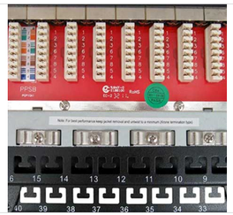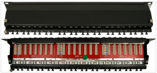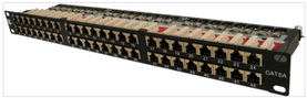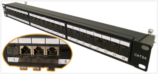 CAT6A Shielded Patch Panel, 24 Port Vertical Cable CAT6A Patch Panels feature the Krone type termination and are 19’’ Rack mountable. They are shielded to protect from excessive EMI. Vertical Cable Shielded Patch Panels comply with a number of requirements: (1) Category 6 ANSI/TIA/EIA-568-C.2, (2) Category 6A TIA/EIA-568-C.2, (3) 3rd Edition IEC 61935-1 (draft/217A/CDV), (4)10 Gigabit Ethernet IEEE P802.3an, and (5) proposed ANSI/TIA- 568B.2-10 Category 6A up to 500 MHz. | Features: • Shielded to protect against EMI, RFI • High Impact Patch Panel • Tough Black Painted Finish • Number Labeled for Easy Identification • 568A & 568B Wiring Color Codes • Krone Type Terminals (22-26AWG) • Mounts on any standard 19’’ rack or wall mount • ETL Verified to ANSI/TIA/EIA 568-C.2 | |
